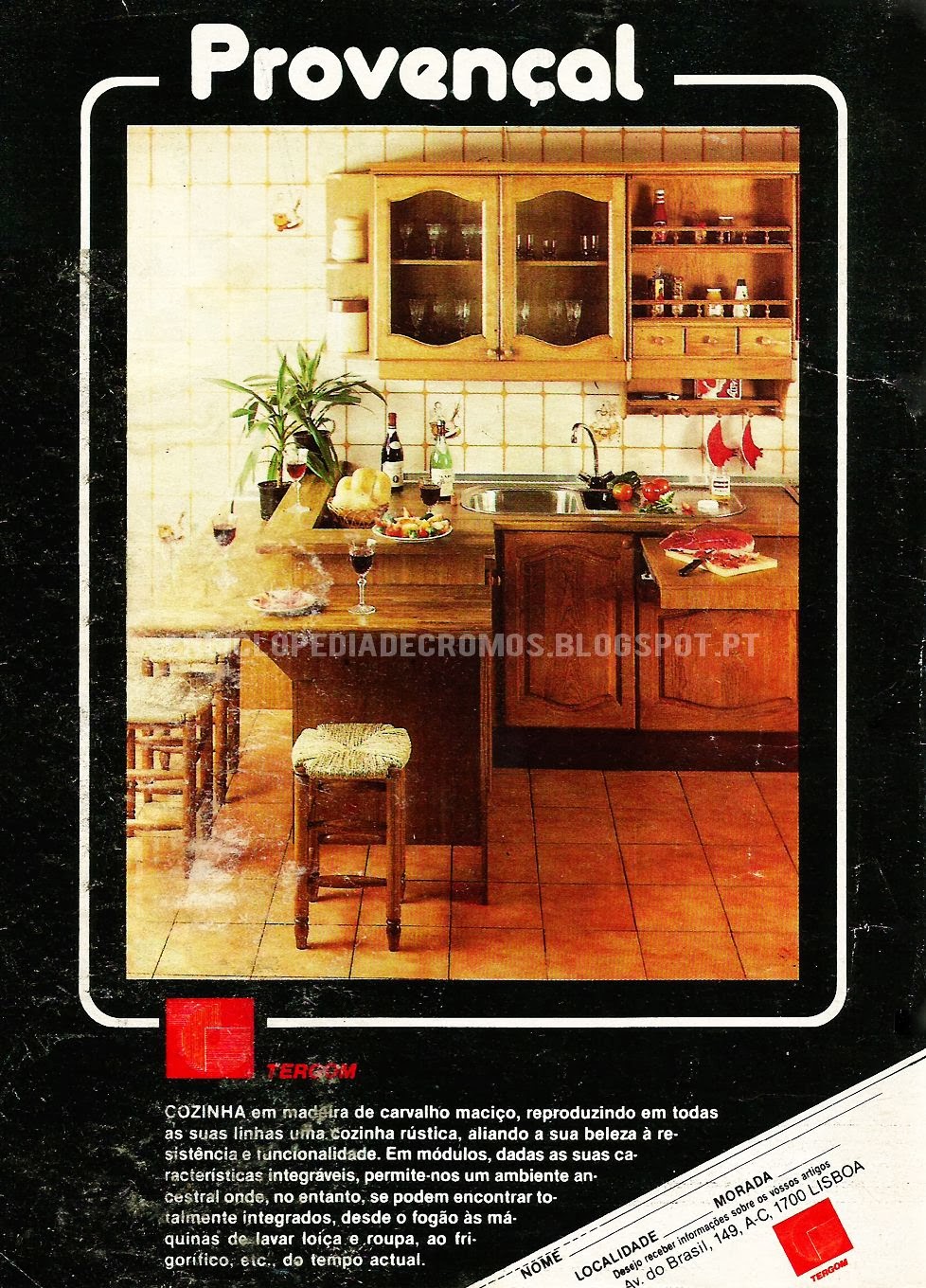 Uma bonita cozinha em madeira de carvalho maciço ocupa a maior parte do anúncio. Marca "Tergom"