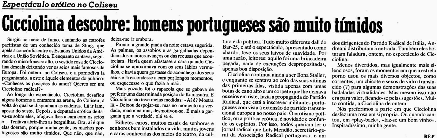 A visita a Portugal devia-se à outra carreira de Cicciolina, a de cantora, com actuação no Coliseu dos Recreios,e a imprensa também lhe dedica algumas palavras: "Cicciolina descobre: homens portugueses são muito tímidos."