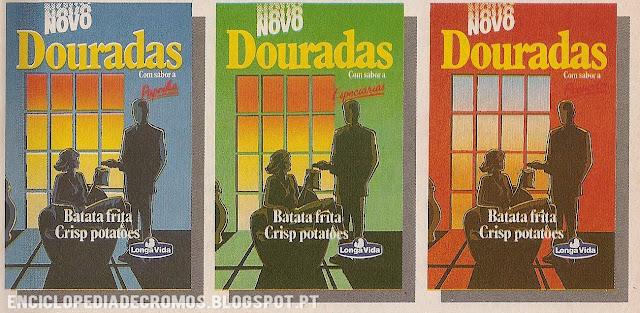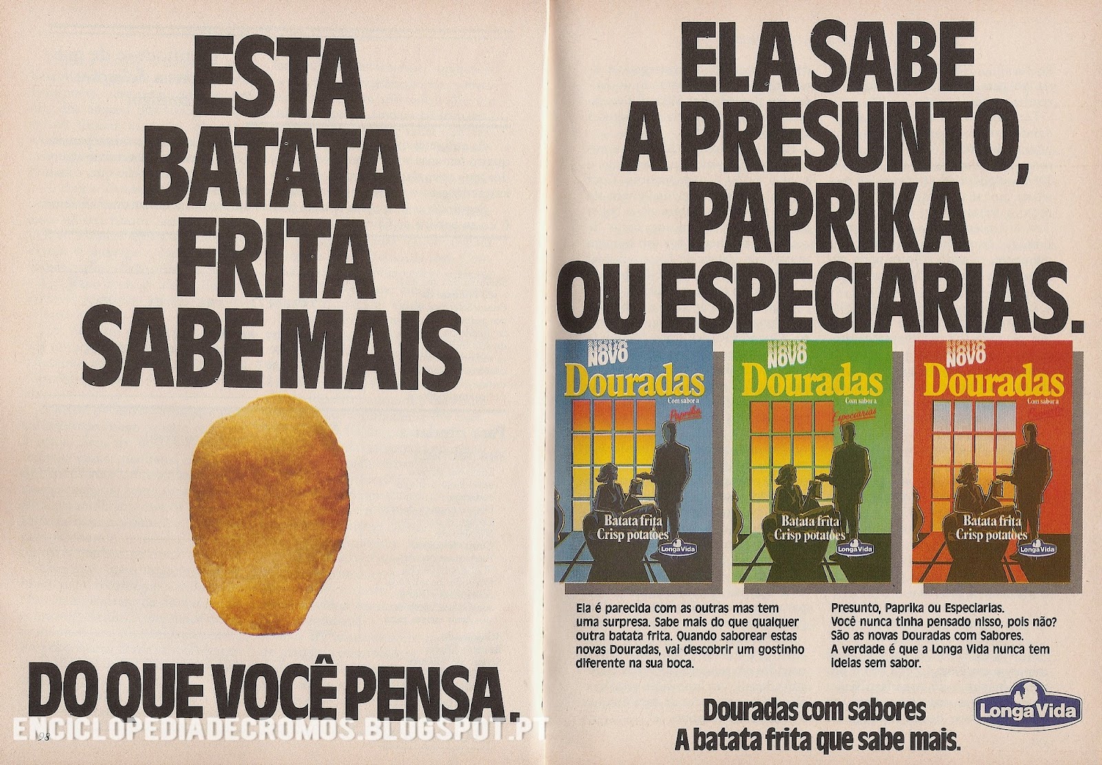 Apesar de cá em casa se ter consumido umas generosas toneladas desta marca de batatas fritas de pacote, sinceramente não me recordava destas variedades com sabores, podia jurar que este tipo de batatas só tinha surgido lá bem meio dos anos 90. Afinal, parece que eu não estava tão atento ao evoluir do mercado de batata empacotada! Neste anúncio de 1988, a "Longa Vida" revela novas "Douradas" com sabores, mais concretamente: Paprika, Especiarias e Presunto.