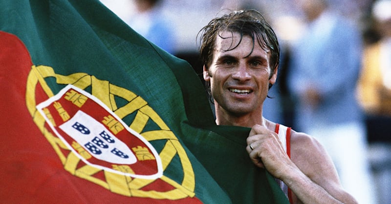 A alegria de Carlos Lopes ao sagrar-se o primeiro campeão olímpico português.